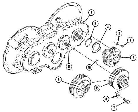 Install step pulley (15) on transfer gearcase (6) with washer (8) and screw (7). Torque screw to