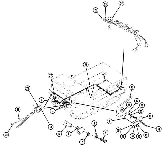 21. Secure wiring harness (28) to main wiring harness (14) across front of carrier and back to fuel compartment with